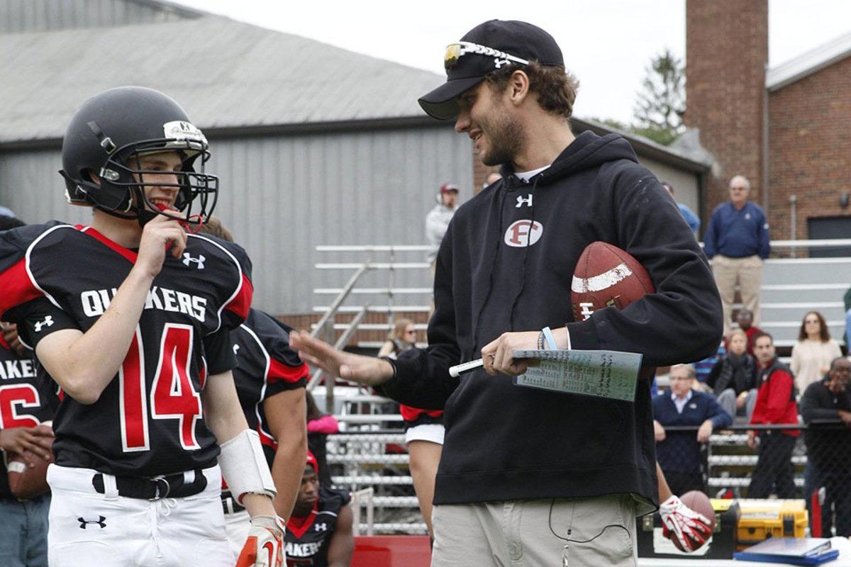 Gunnar esiason, boomer esiason’s son, is coaching high school football. Closeup portrait of friends academy gunnar esiason posing before game